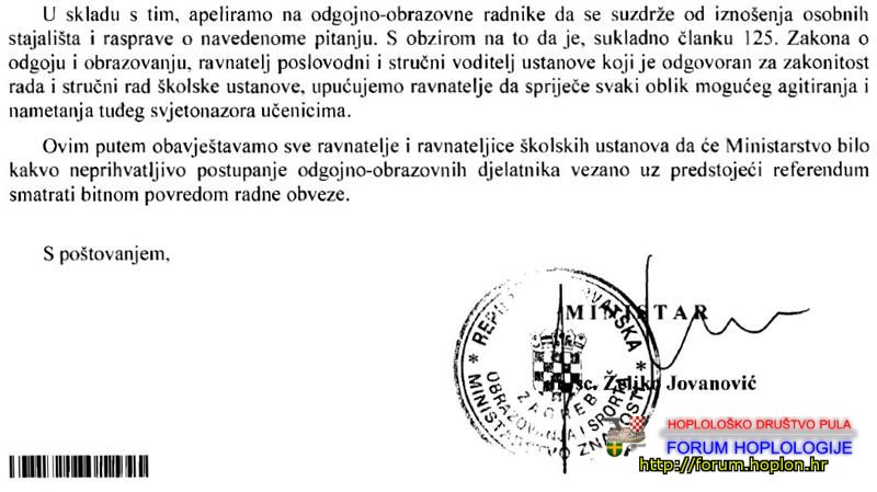 Ministar Jovanović je u svom priopćenju zatražilo od učitelja da "se suzdrže od iznošenja osobnih stajališta i rasprave o navedenom pitanju", te da ravnatelji spriječe svaki oblik mogućeg agitiranja i nametanja tuđeg svjetonazora učenicima". Suprotno ponašanje će se smatrati "...bitnom povredom radne obveze". Drugim rječima, tko tako ne postupi, dobit će otkaz.